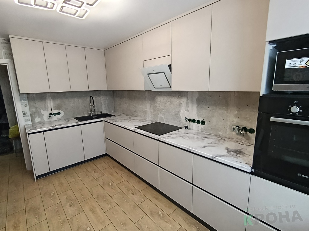 | Вид кухни: | кухня угловая, фасады лакокраска, интегрированные ручки |