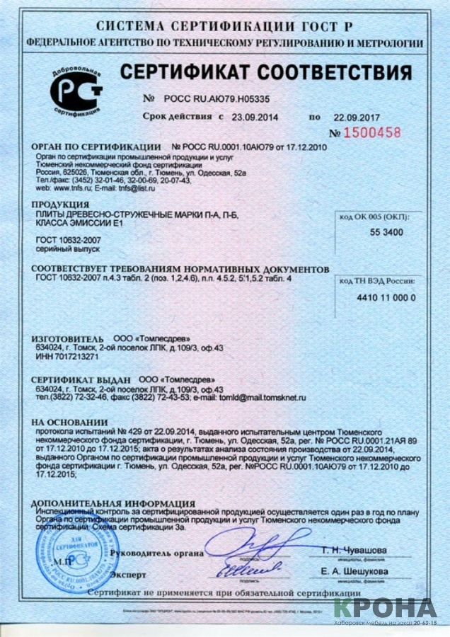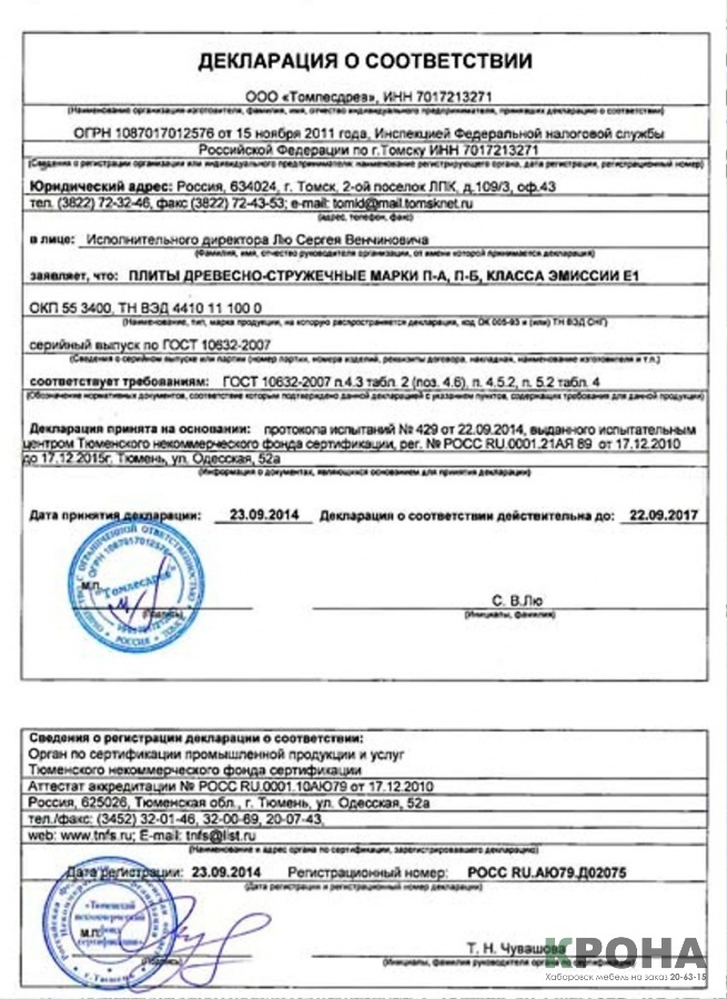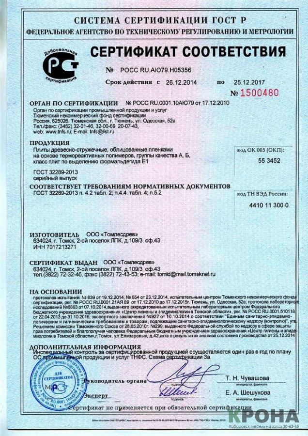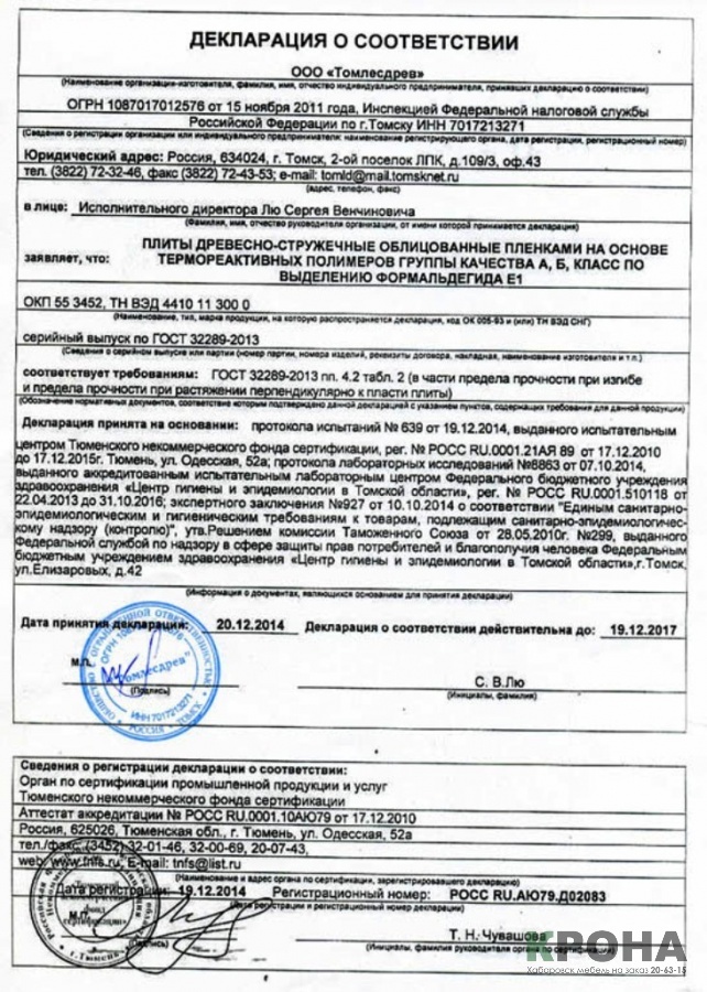 Ниже мы приводим сертификаты соответствия на ЛДСП которую используем при изготовлении шкафа купе на заказ в Хабаровске, встроенных кухонь на заказ, а так же и другой мебели: