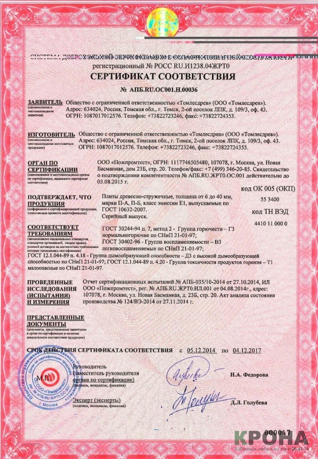 Продукция ООО "Томлесдрев", плиты древесно-стружечные марки П-А, П-Б, класс по выделению формальдегида Е1, произведенные по ГОСТ 10632-2007, соответствует требованиям безопасности ГОСТ 10632-2007 п. 4.3 табл.2 (поз. 1,2, 4.6), п. 4.5.2, пп. 5.1 и 5.2 табл 4.Сертификат пожарной безопасности на ЛДСП и ДСП