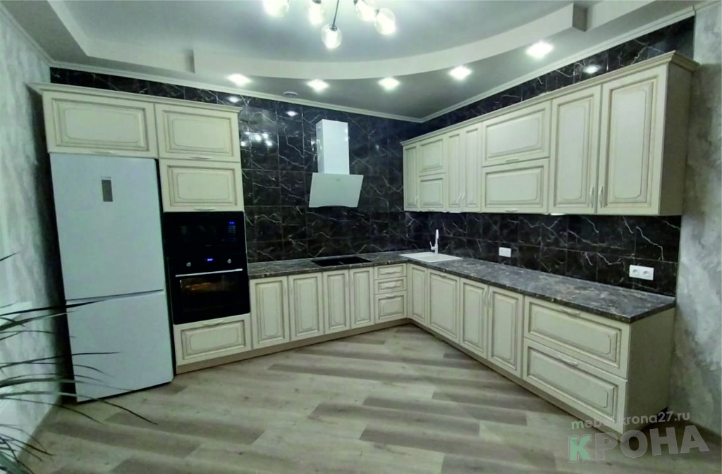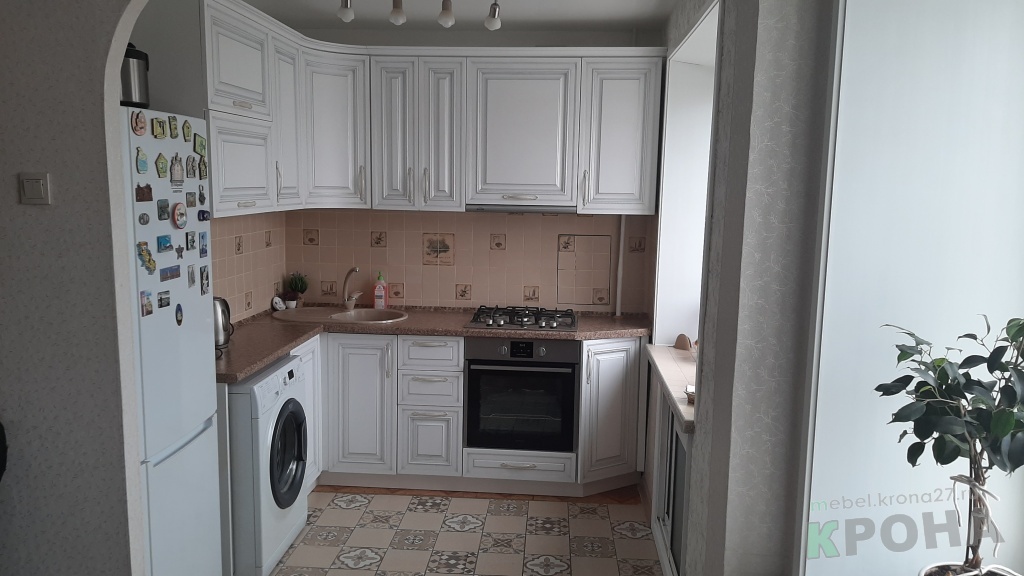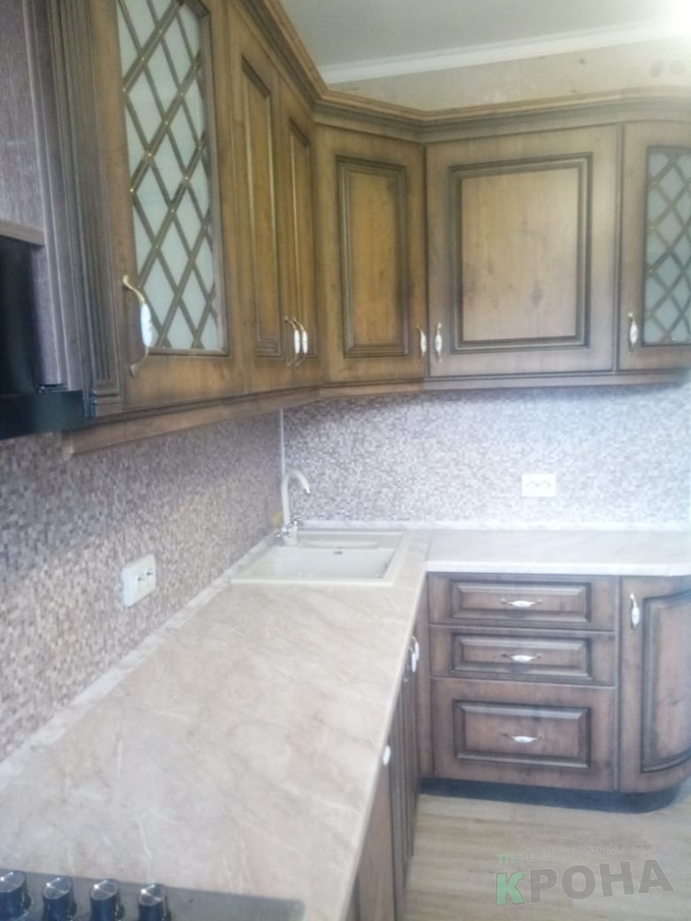 | Вид кухни: | кухня угловая, фасады-мдф пленка, классическая кухня, патина |
