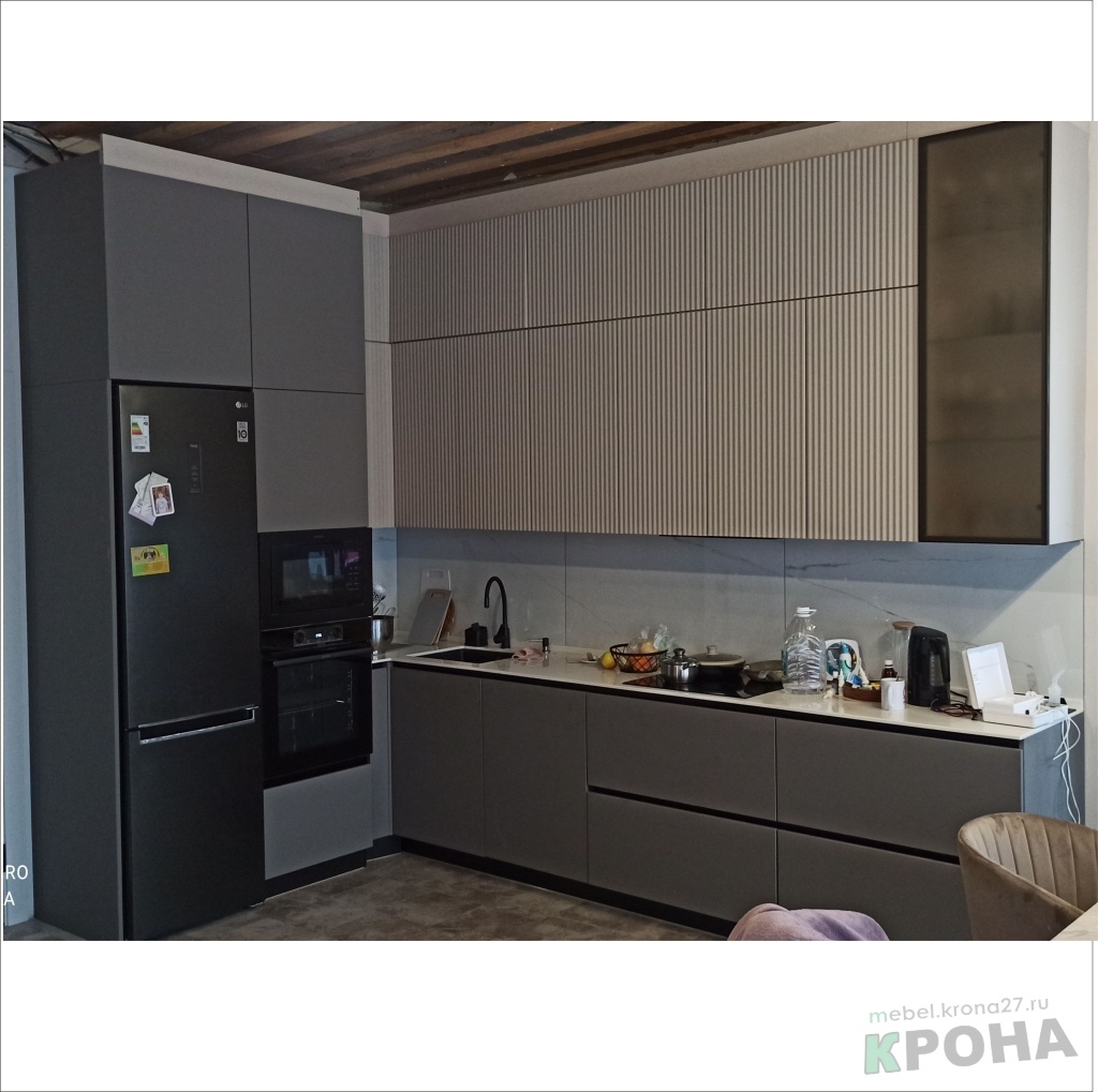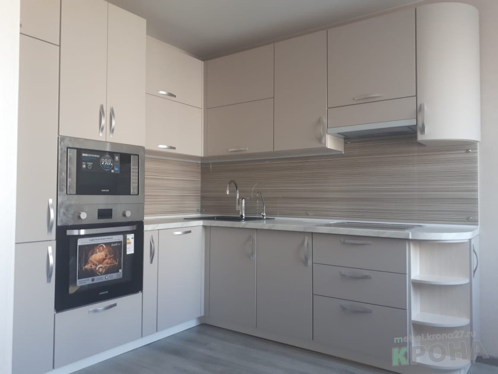 | Вид кухни: | угловая кухня, фасады мдф-пленка, интегрированные ручки |
