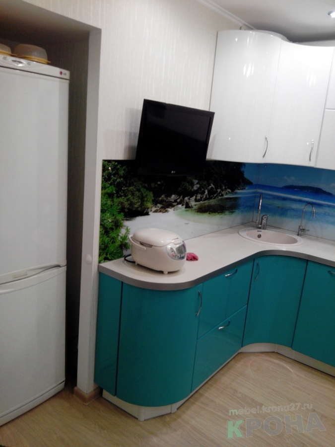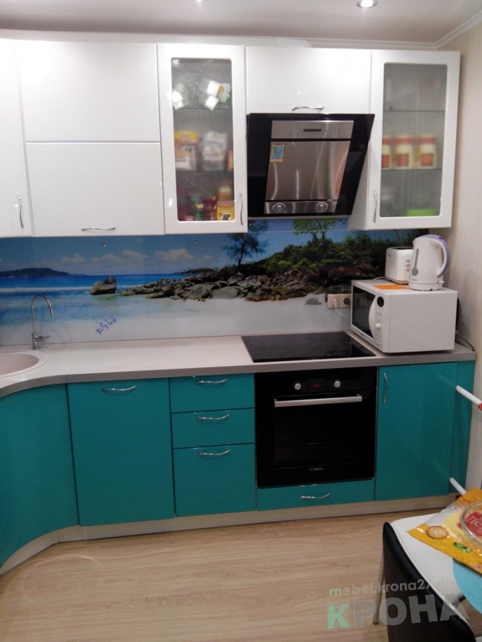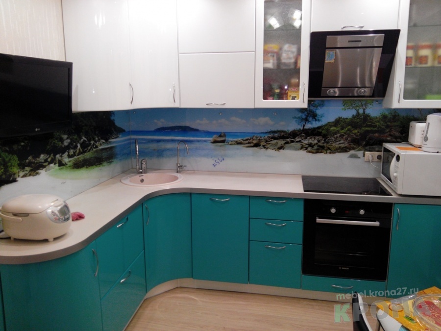 Хозяйка на кухне проводит значительную часть времени. Поэтому кухонный гарнитур должен быть не только практичный, но и радовать глаз. В данном случае получилась полная гармония. Белый глянец сверху переходит через фотопечать, на стеновой в бирюзовый. Плавность линий создают гнутые дверки. На данной кухне можно отдыхать во время готовки.