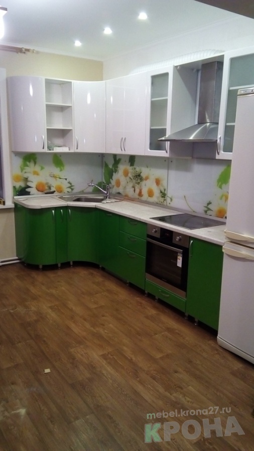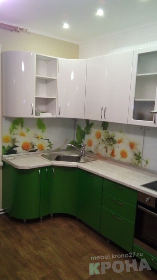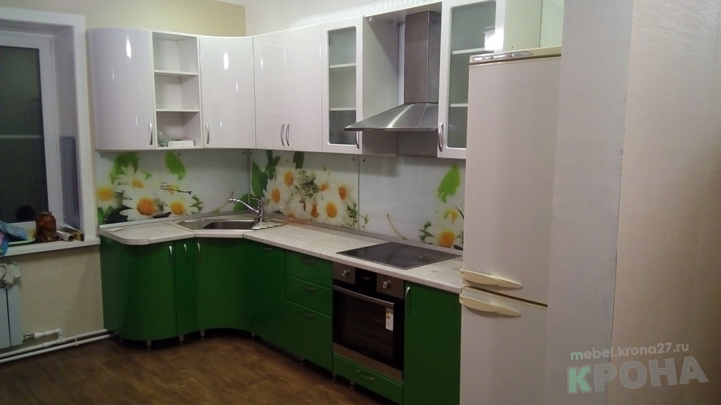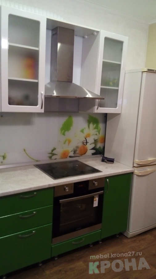 Кухня с пленочными фасадами и фатопечатью. Не большая, уютная кухня,решённая в цветовой гамме живой природы. Сочная зелень фасадов и ромашки на стеновой панели наполняют помещение свежестью и светом. Здесь хочется находиться:испечь пирог и всей семьёй попить чай.