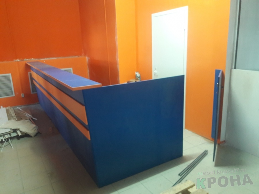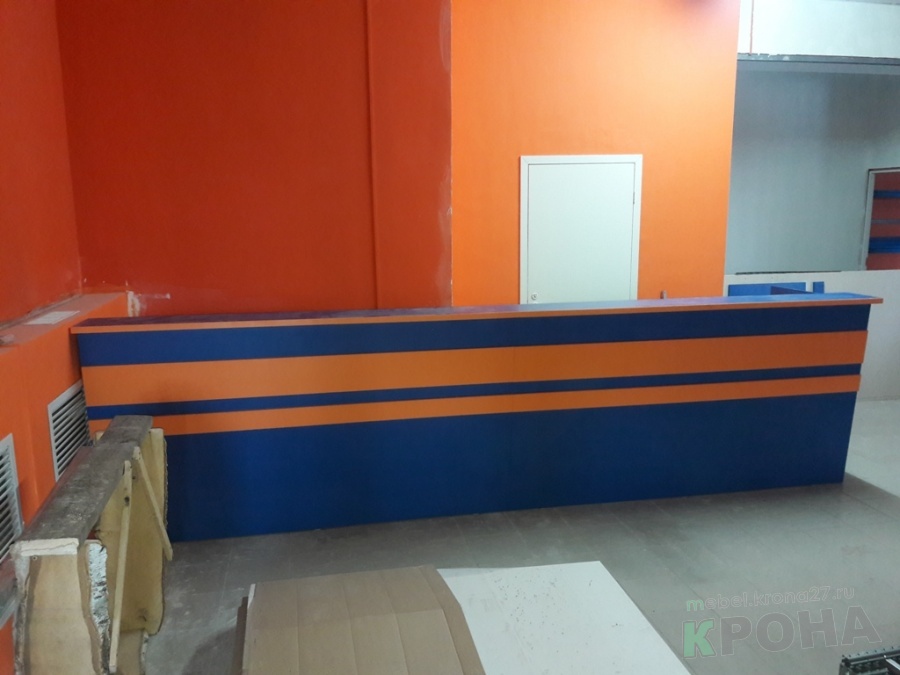 Ресепшн в автомагазин. Ресепшн удобно отделяет рабочую зону менеджеров от общего зала. Мебель выполнена в цветовой гамме автомагазина и встроена с учётом особнности конфигурации помещения.Стойка администратора – это предмет, который посетитель видит в первую очередь. Поэтому он должен быть не только функциональным, но и презентабельным, а также поддерживать общий корпоративный стиль.