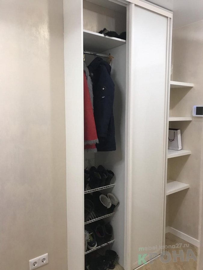Шкаф купе в прихожей с полками При изготовлении шкафа использовали существующую нишу что позволило не занимать площадь прихожей но поставить в шкаф корзины сетки и вешала Справа установлены полки ЛДСП толщиной 32 мм Шкаф органично вписан в небольшую прихожую и полноценно используется для хранения вещей