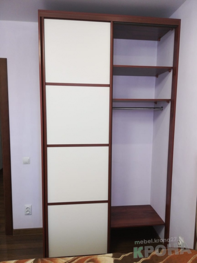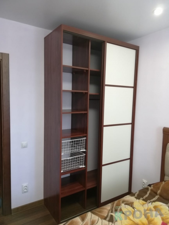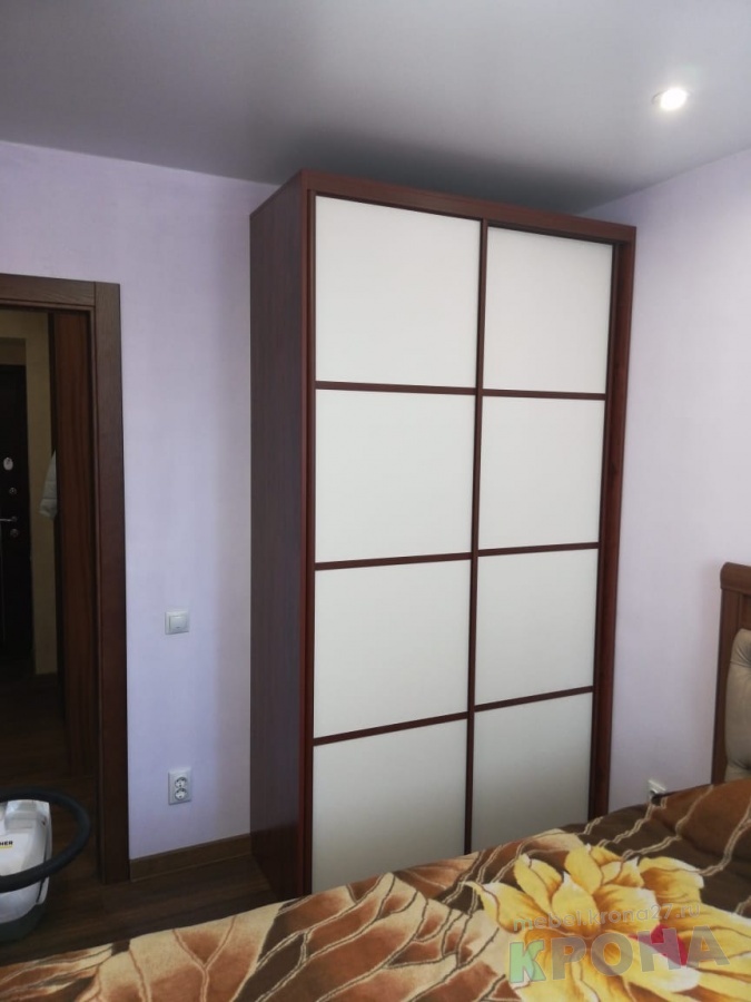 Шкаф купе в спальню ЛДСП по цвету максимально подобрана к стоящей в спальне мебели Светлое наполнение дверей эффектно подчёркивает тёмную мебель и добавляет света в помещении