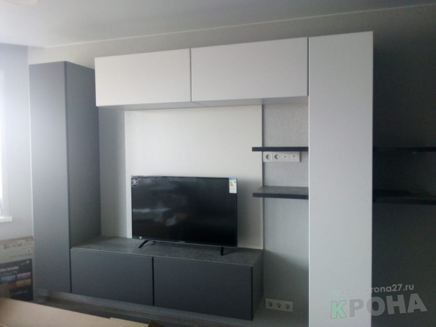 Удобная, красивая, практичная стенка под TV Выдвижные ящики снизу,антресоли на подъёмниках, дверцы на шкафах-всё открывание Push up(без ручек) Фасады МДФ плёнка ПВХ г. Владивосток (цвета:"Белый матовый" и "Графит матовый")