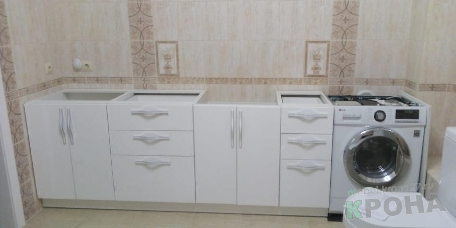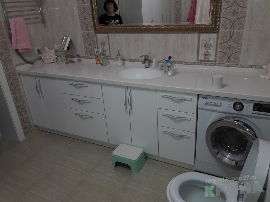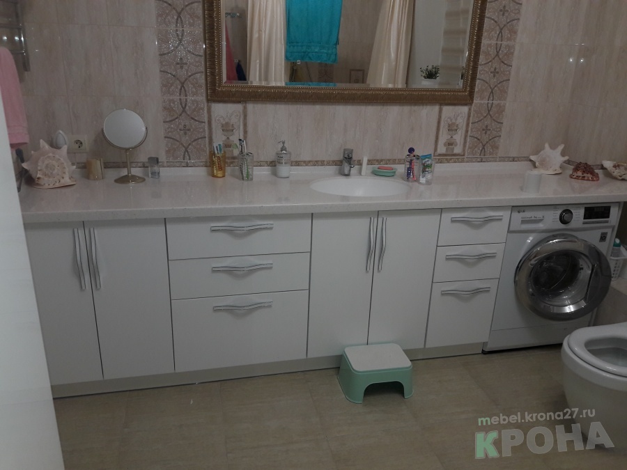 Корпуса мебели в ванную ЛДСП Россия, фасады МДФ лакокраска (цвет белый глянец) При изготовлении были учтены размеры помещения и расположение сантехники В шкафу удобно размещается одежда и есть место для хозяйственных предметов