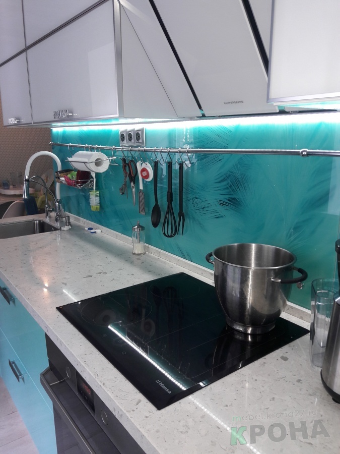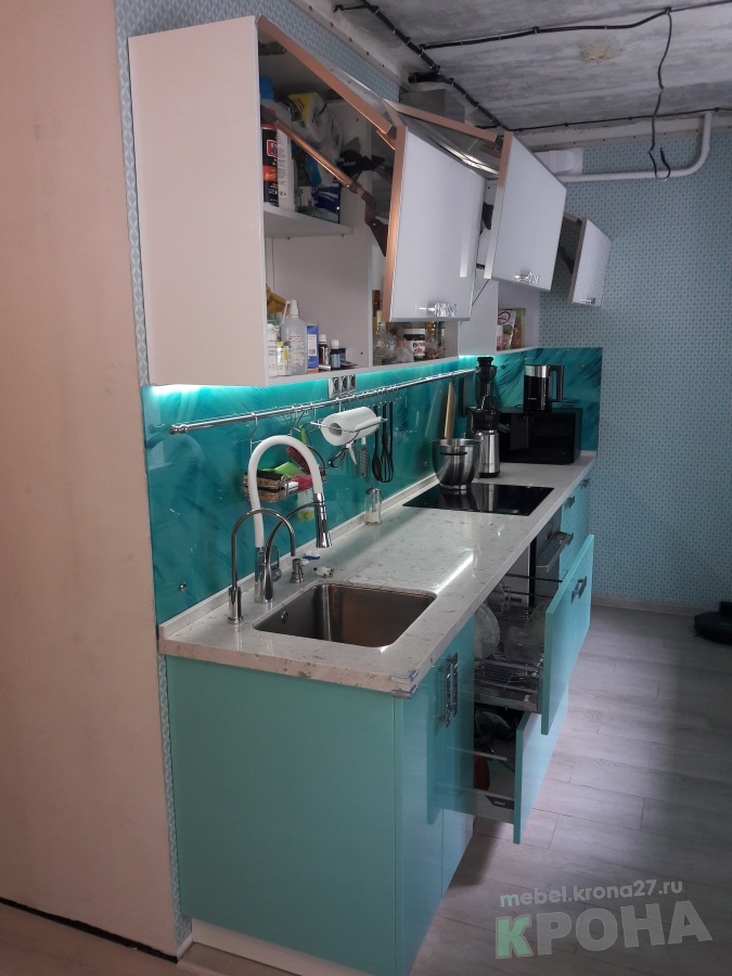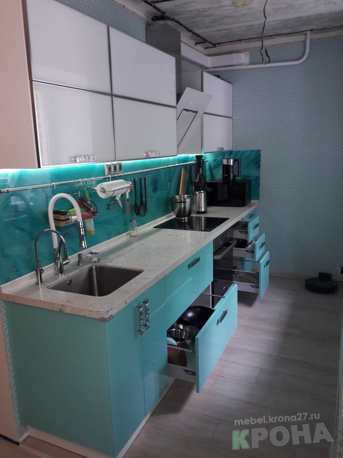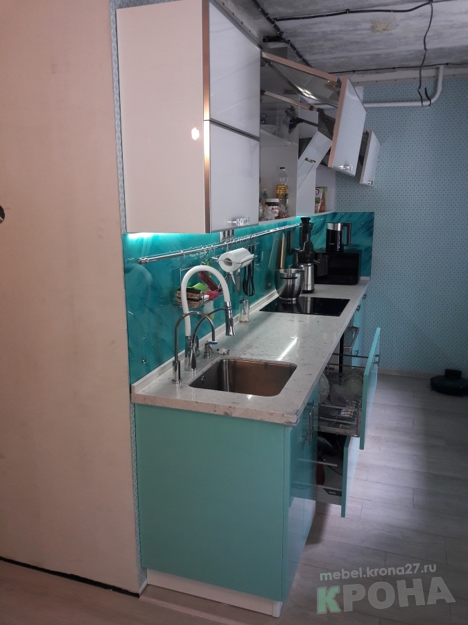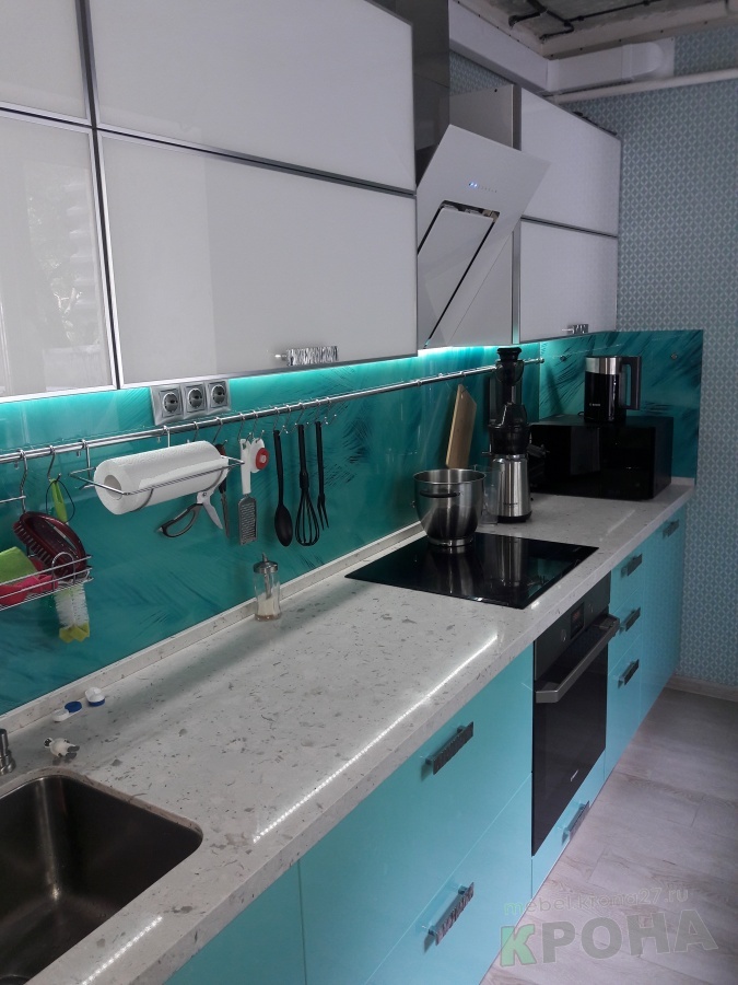 Кухня прямая Корпус ЛДСП Россия Фасады верх стекло в алюминии, низ МДФ лакокраска(цвет по образцу заказчика) Стеновая панель фотопечать на стекле Подъёмники и направляющие "Blum"Сушка для посуды 900 мм в нижнем ящике Столешница и плинтус кварц Цоколь "Rehau" белый Подсветка по всей длине кухни