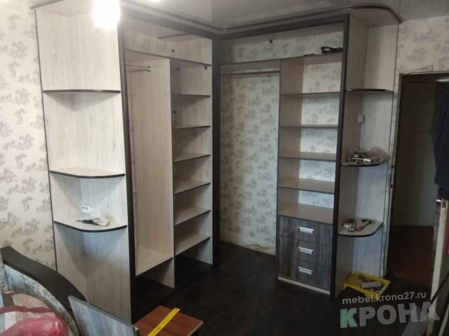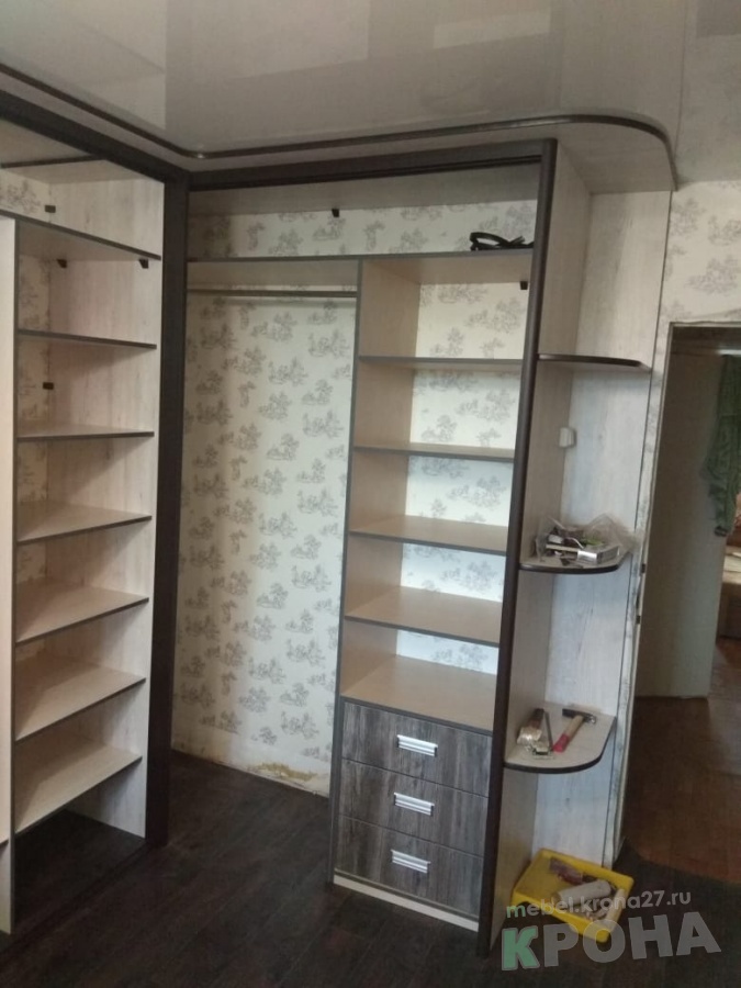 Шкаф купе угловой, ЛДСП Россия, наполнение:полки, штанги, 3 ящика,на открытых полках кромка ПВХ 2 мм.