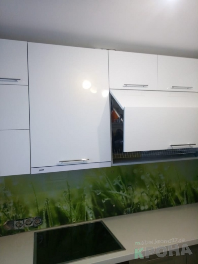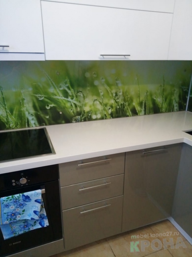 Кухня угловая, ЛДСП Россия, фасады МДФ лакокраска , стеновая панель стекло фотопечать , столешница кварц AD711, высота верхних шкафов 930 мм.
