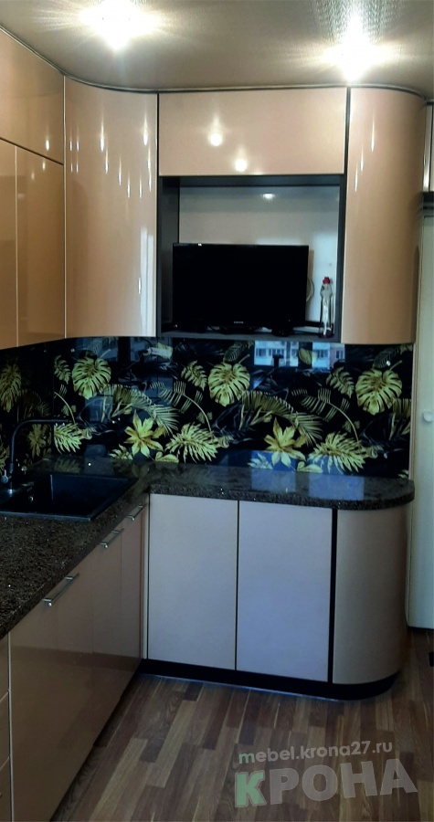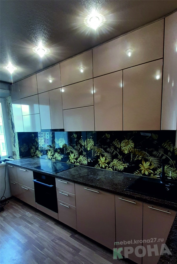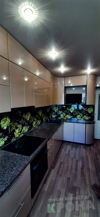 Угловая кухня с фасадами Lamaty лакокраска "Арабика". Минимализм в интерьере кухни отлично дополняют лаконичные фасады без ручек на верхних шкафах. Столешница выполнена из Кварца, стеновая панель стекло с фотопечатью.