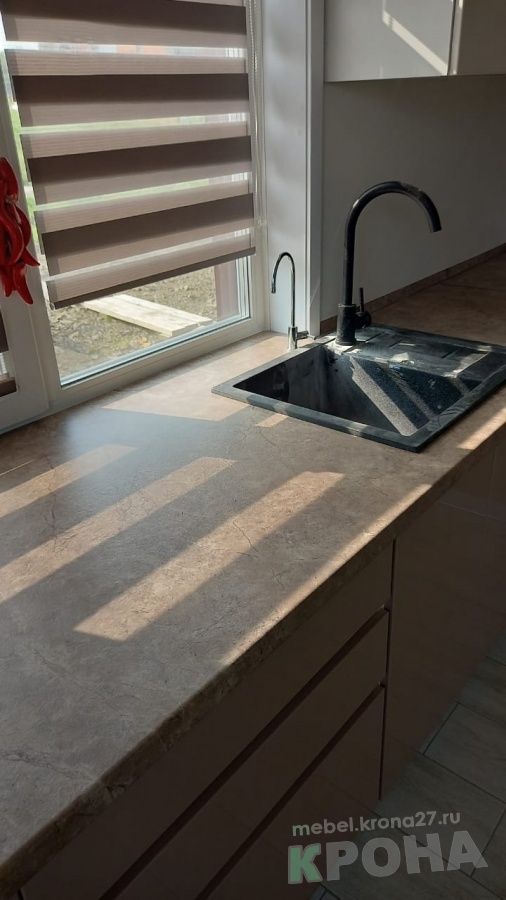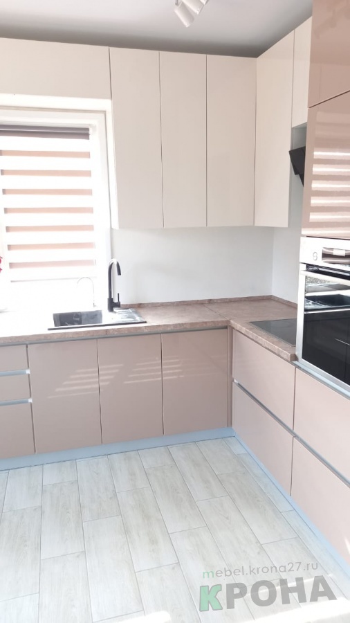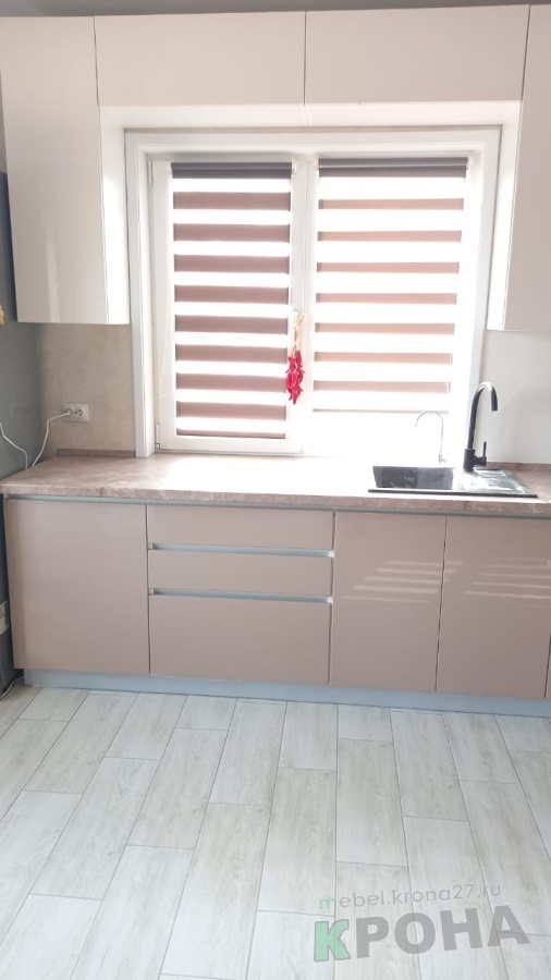 Кухня мечты может быть реальной! Ничего лишнего и при этом такая уютная.. Выполнена в нежных цветах Томских мебельных фасадов Российских производителей в цвете верх молочный глянец и низ мокко глянец. скрытая ручка гола оставляет кухню выглядеть сдержанной, а мойка напротив окна никого не оставит равнодушным. Встроенный духовой шкаф на уровне столешницы порадует вас своим комфортом.
