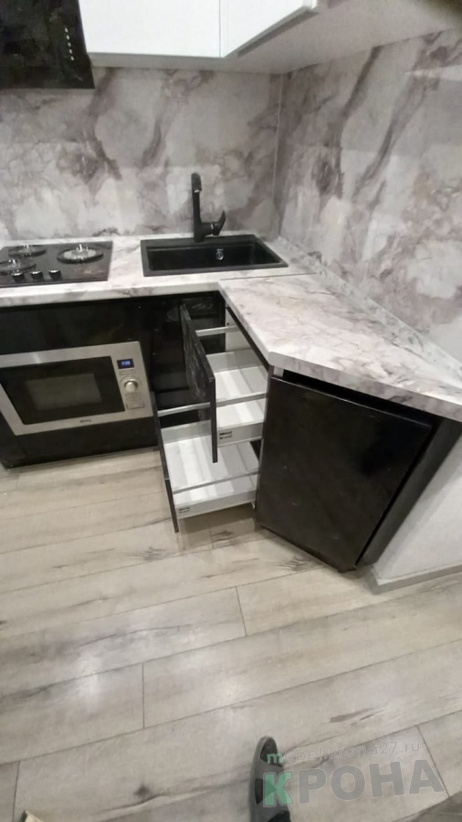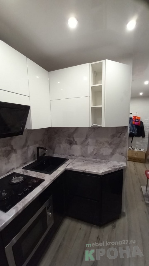 Кухни в хрущевках... Как же мало места для реализации кухни и сделать так, чтобы все вместилось и было максимально функционально. С таким сталкиваемся часто и для нас нет невозможного! Посмотреть только на эту кухню, в ней уместилась вся необходимая техника,а фасады из белого и черного супер глянца визуально увеличили пространство. Сделали акцент на столешнице и стеновой панели и не прогадали!