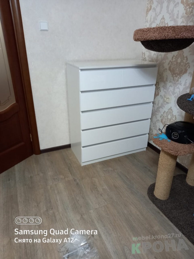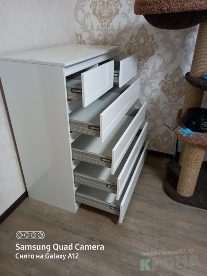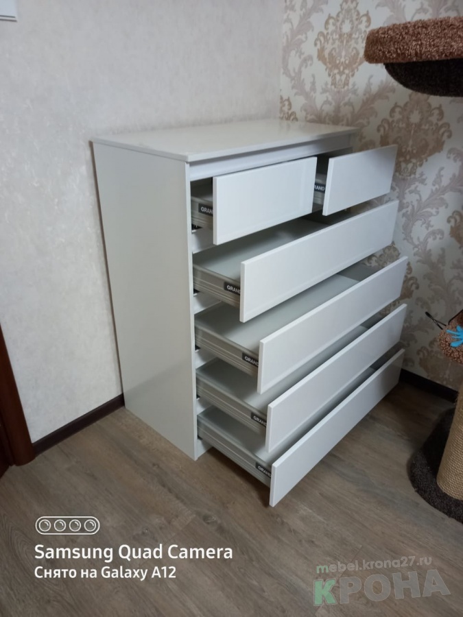 Комод изготовлен из ЛДСП коллекции lamarty Белый глянец. Дверки из МДФ покрытые высокоглянцевой белой пленкой. Фурнитура метабоксы с доводчиком Grand. Ручка Gala
