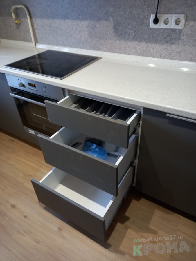 | Фурнитура: | петли с доводчиком grand, цоколь rehau, направляющие grand, столешница ледяная искра |