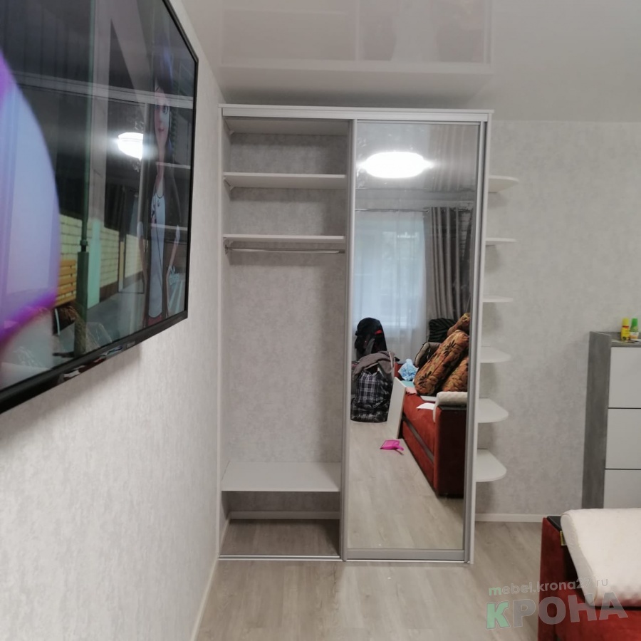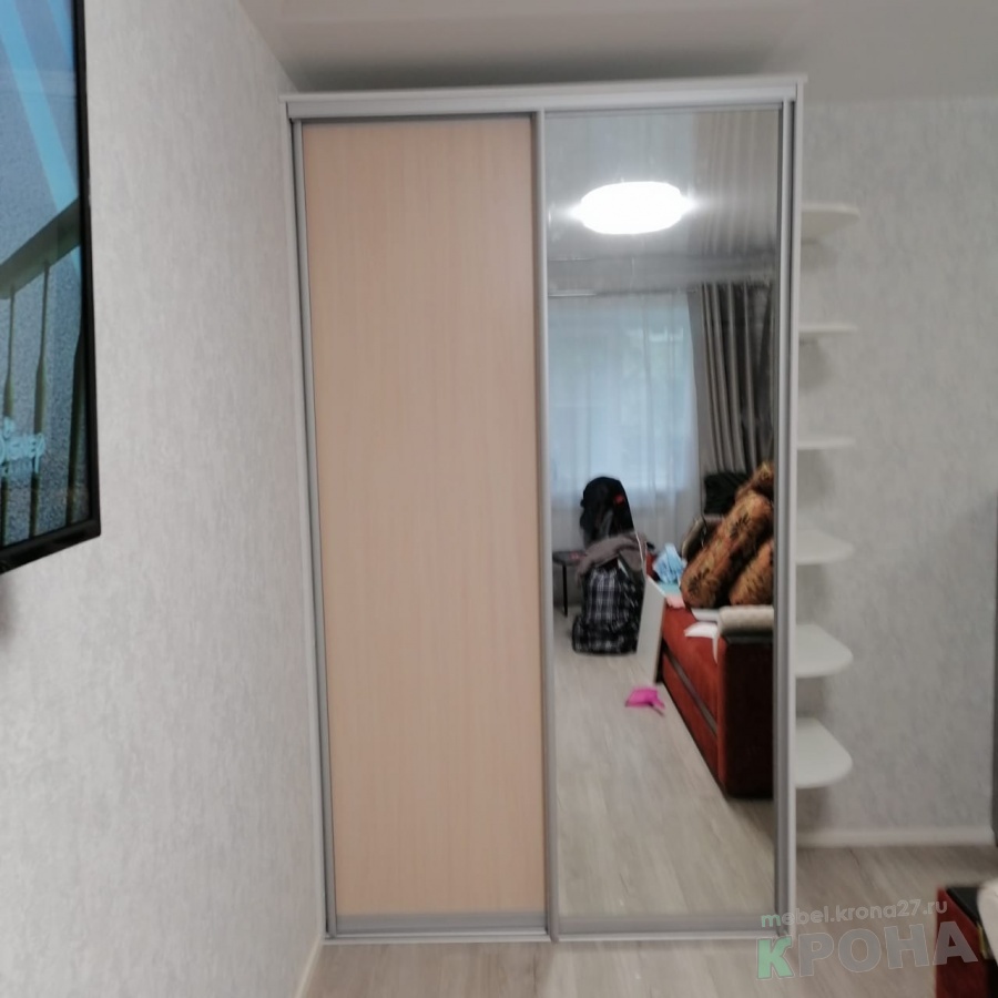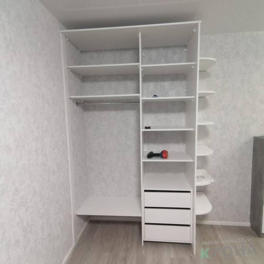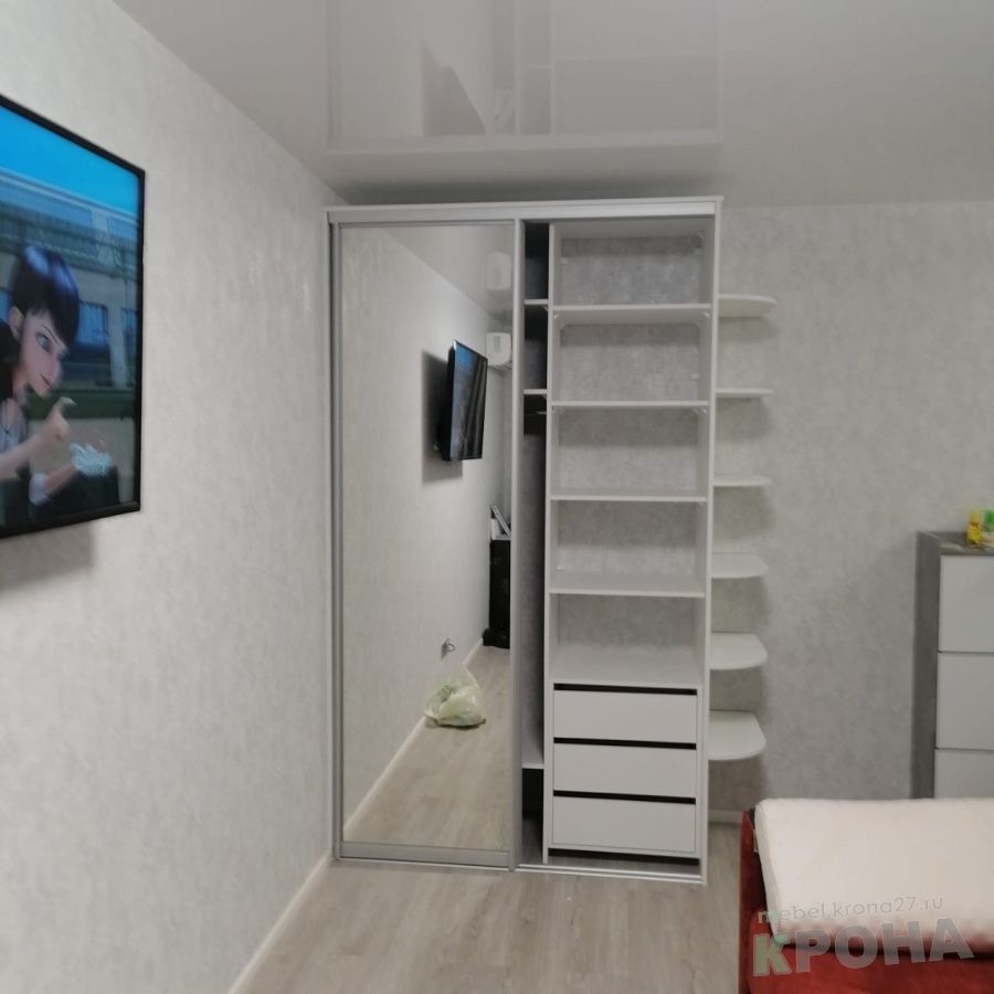 Шкаф купе с угловыми полками. Не смотря на небольшие размеры, шкаф получился вместительным и функциональным. Здесь есть и вешалка под вещи и полочки. В выдвижных ящиках поместятся много нужных мелочей.