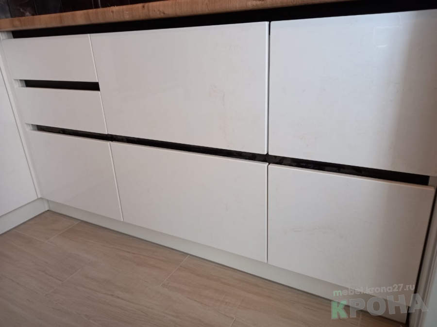 Современная кухня с интегрированными ручками.Гарнитур без лишней фурнитуры в виде видимых ручек будет казаться легче.Отсутствие лишних деталей на кухне. За выступающие части на кухонном гарнитуре можно зацепиться одеждой или проводными наушниками. Некоторые же конфигурации гарнитуров и вовсе способствую ударам о выступающие части. В целом такое оформление весьма рационально,и безопасно для детей