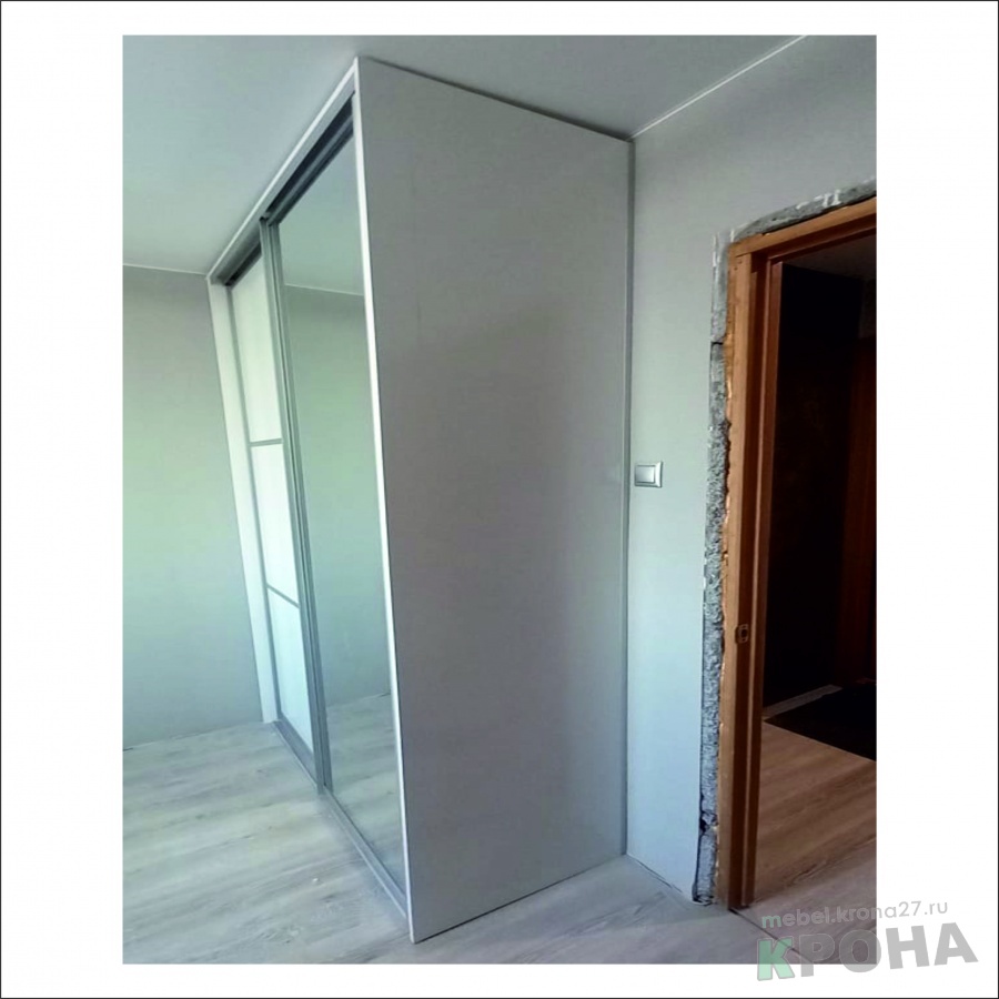 Шкаф купе изготовлен из ДДСП коллекция lamarty белоснежный глянец, двери система купе aristo хром матовый, наполнение дверей: 1 - ЛДСП в разделении на 3 части, 2 - зеркало серебро