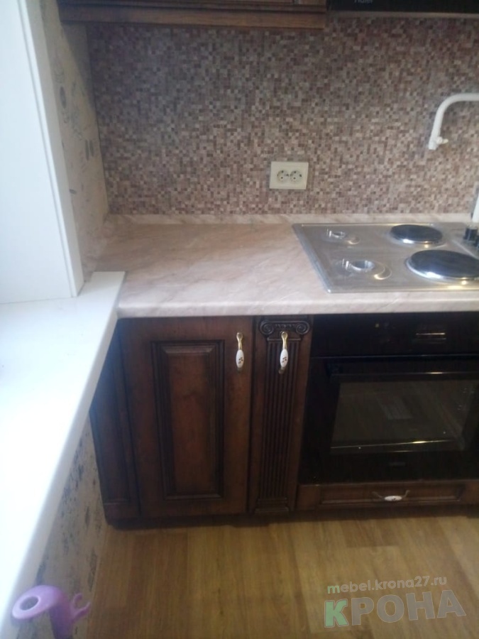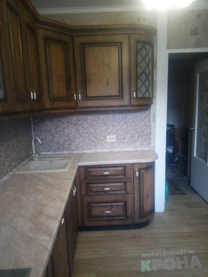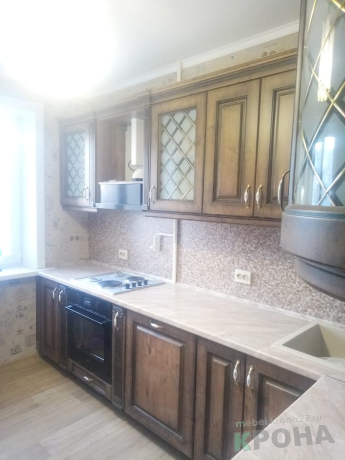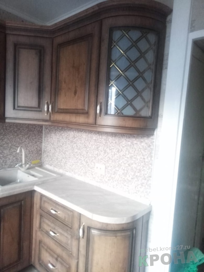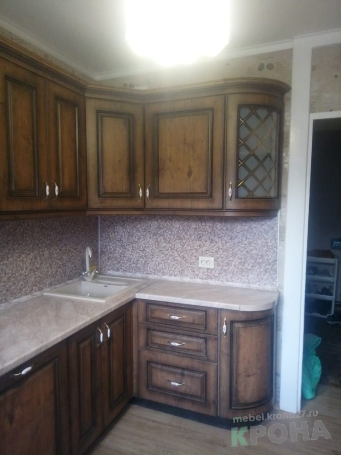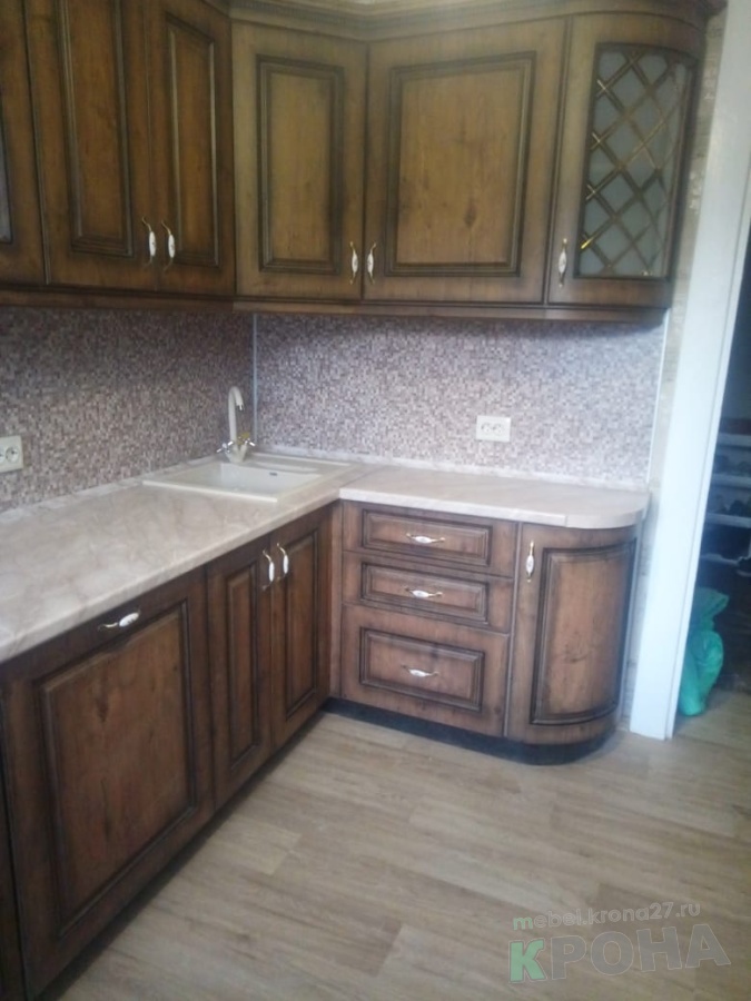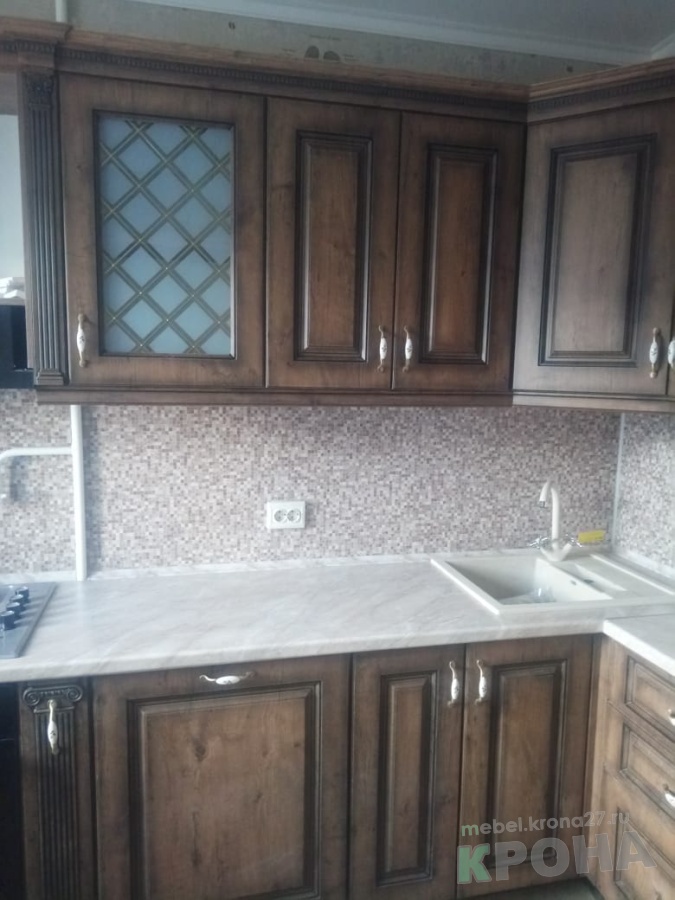| Вид кухни: | кухня угловая, фасады-мдф пленка, классическая кухня, патина |
