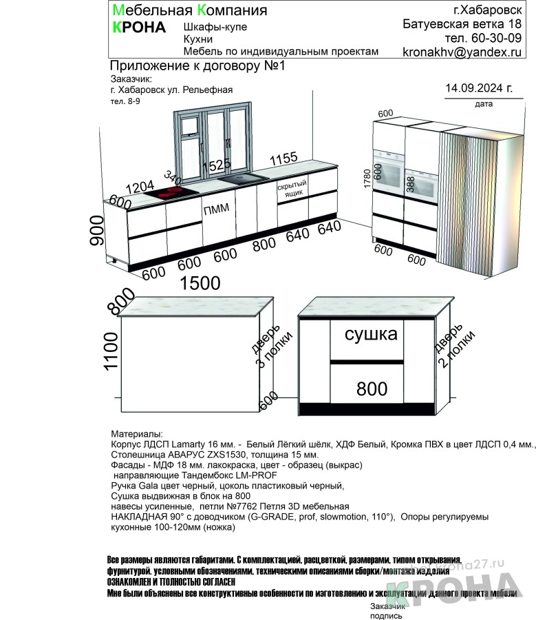 | Фурнитура: | петля 3d мебельная накладная 90° с доводчиком (g-grade, prof, slowmotion, 110°), цоколь rehau, направляющие тандембокс lm-prof, столешница аварус zxs1530, толщина 15 мм. |