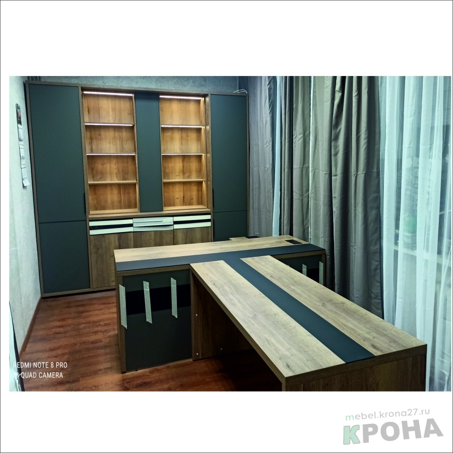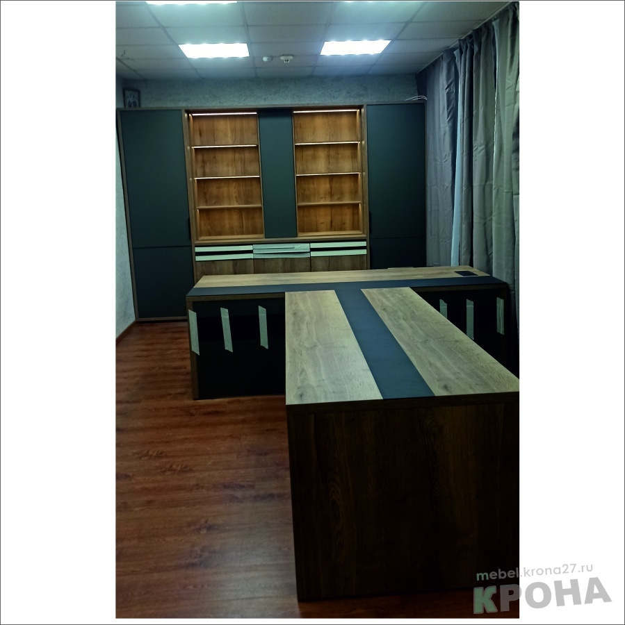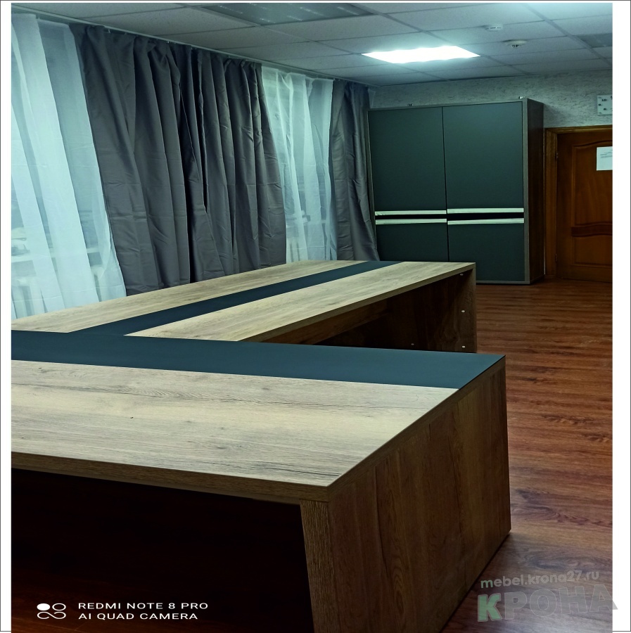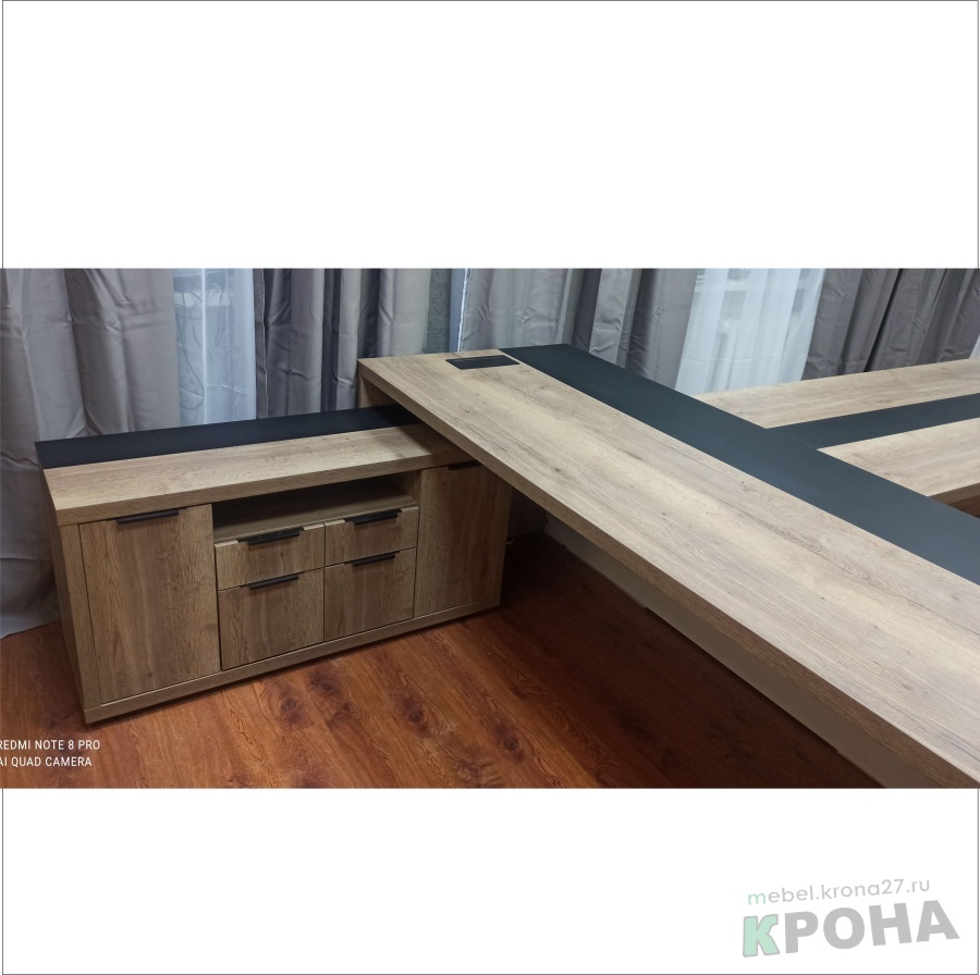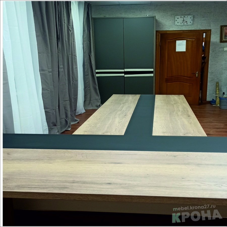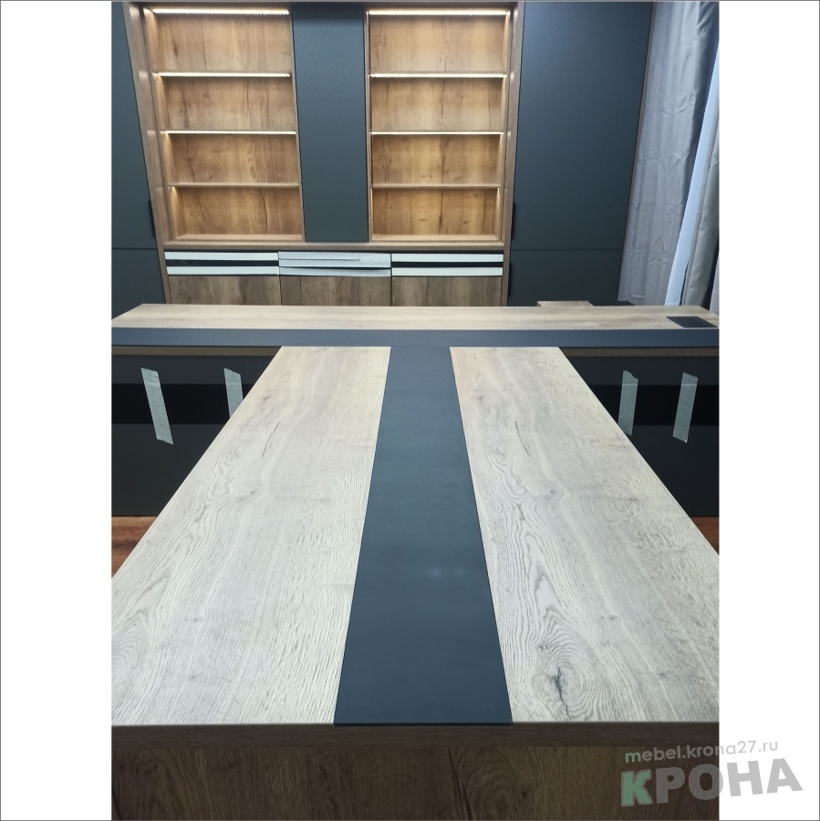 В комплект входит: Стол руководителя 2200*950*770, Брифинг 2200*850*770, Тумба комбинированная приставная 1200*450*600, Шкаф для одежды 1200*550*2450, Стенка 3200*580*2450 Материалы: ЛДСП 16, 32, 40 мм. - цвет Дуб Галифакс табак, МДФ AGT 18 мм.№ 726 супермат серый шторм, Стекло закаленное 5 мм. покрашенное по каталогу RAL№9005 и обработанное сплошным нанесение пескоструйной поверхности на стекло